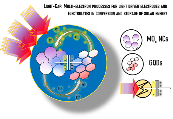 The intermittent character of solar-energy and the need to store it efficiently is undoubtedly the Achille’s heel of current photovoltaic/energy storage systems like silicon solar panels and big batteries characterized by high costs of installation and maintenance and by large sizes and high weight. LIGHT-CAP will launch a long-term technological vision in Europe that combines energy conversion and storage into one single compact unit with low volume and weight, based on environmentally friendly and Earth abundant materials, with the additional cost benefit delivered by solution processing. LIGHT-CAP’s science enabled hybrid technology is based on the exploitation of the cooperative electronic properties of zero-dimensional and two-dimensional nano-materials, which take over the role of both the light energy conversion and storage, together with the unique opportunity to accumulate multiple delocalized charges per nanostructural unit after photo-activation.