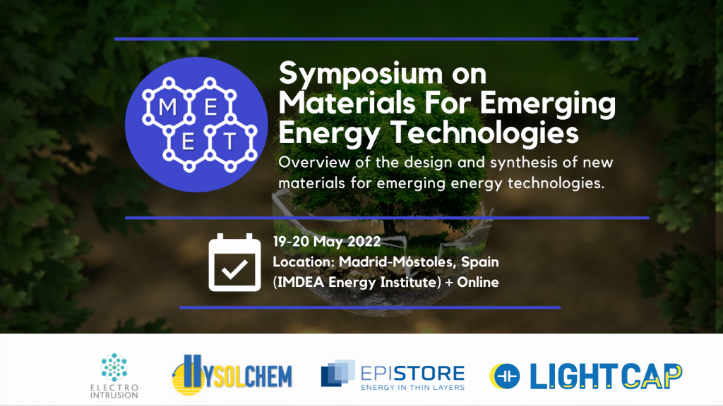 HYSOLCHEM, LIGHT-CAP, EPISTORE, and ELECTRO-INTRUSION will present a “Symposium on Materials for Emerging Energy Technologies” (MEET Symposium) event on May 19-20, 2022 at Madrid-Móstoles, Spain (IMDEA Energy Institute) and virtually.